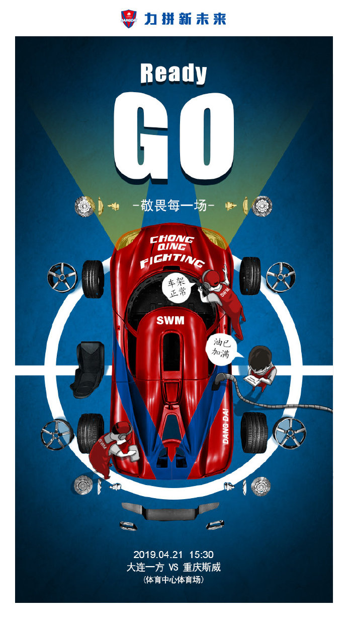 渝超,重庆城市足球联赛,渝超赛程,渝超直播,渝超积分榜,渝超球队/渝超(重庆城市足球联赛)为重庆足球迷带来最新赛程、比分、积分榜、球队信息及直播入口,精彩赛事一网打尽。直播吧4月18日讯 北京时间4月21日15:30,中超联赛第6轮,重庆斯威将客场挑战大连一方。赛前,斯威官方发布了本场比赛的预热海报,标题为:Ready,Go!(准备,出发!)斯威官方微博配文写道: