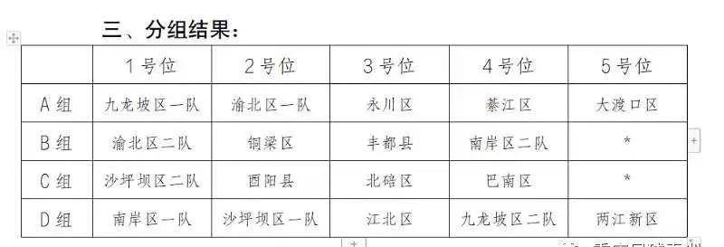 根据规则,上届比赛的前四强成为4个小组的种子队。由于上届第四名江津中学并没有报名,渝北区二队取代他们成为种子队。四个小组具体的分组情况如下: