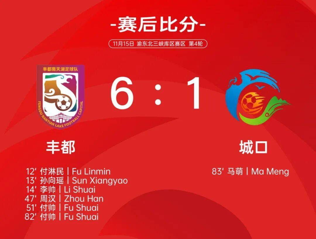 下半场开场仅2分钟,丰都再次闪击得手,9号球员周汉帮助主队4:0领先。尽管早早取得大比分领先,但丰都攻势不减,付帅分别在第51分钟和第82分钟破门,将比分改写为6:0。第83分钟,城口由15号马萌打入一球。