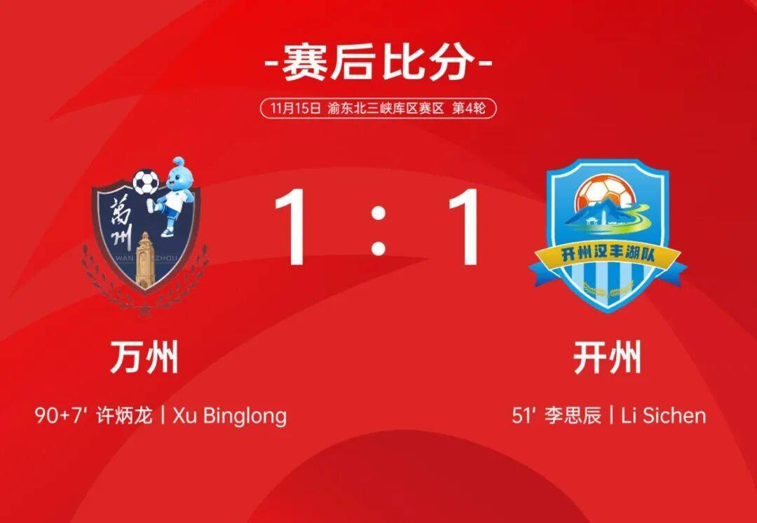 最终,双方1:1握手言和。4轮比赛后,丰都4战全胜,积12分领跑,开州和万州各取1分,目前以8分分列赛区第3和第4名。
