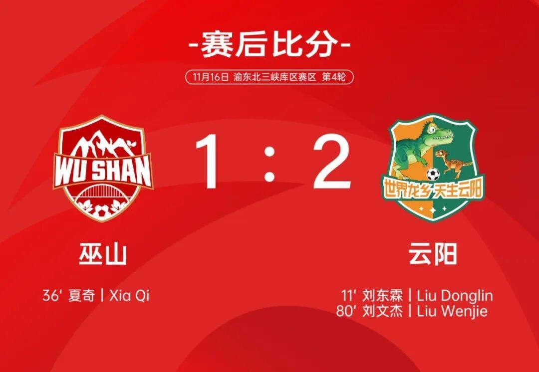 第11分钟,云阳24号球员刘东霖任意球直接破门,率先为客队取得进球。第36分钟,巫山同样获得弧顶任意球机会,9号球员夏奇的射门划出一道美妙的弧线,直接窜入球门左上角,1:1,巫山将比分扳平。第80分钟,云阳34号球员刘文杰中路接队友传球倒地铲射破门,帮助客队2:1领先,巫山随后大举进攻,无奈破门乏术,最终主场1:2告负。