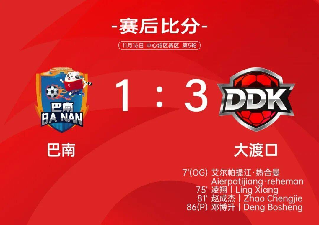 第7分钟,巴南进攻造成混乱,大渡口球员艾尔帕提江·热合曼不慎自摆乌龙。第75分钟,大渡口右路传中,42号球员凌翔禁区内头球破门得分,将比分扳成1:1平。第81分钟,大渡口利用角球机会,由41号球员赵成杰将比分反超。第86分钟,大渡口获得点球机会,19号邓博升一蹴而就,将比分锁定为3:1。