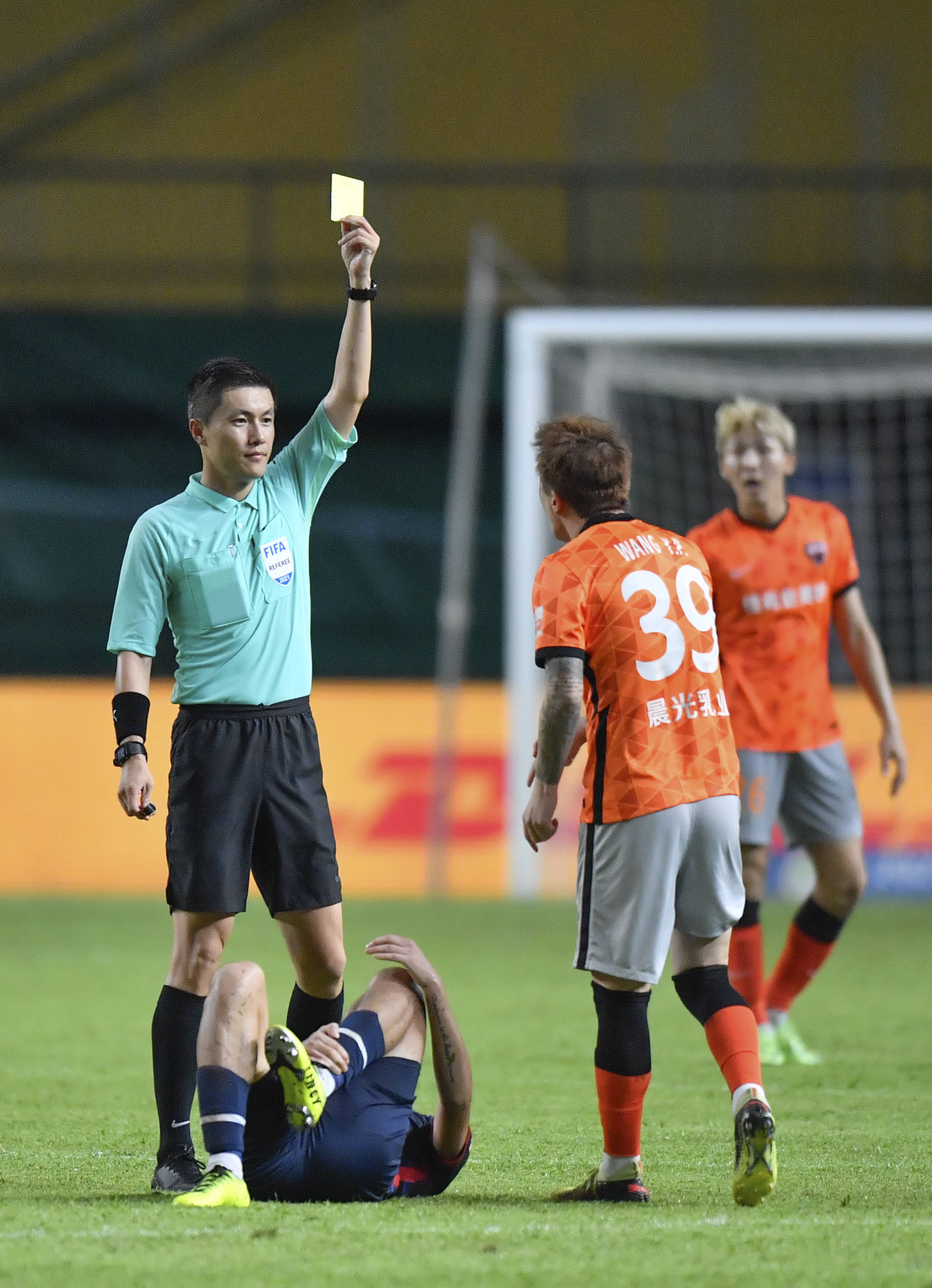 8月11日,主裁判沈寅豪(左一)在比赛中向深圳队球员王永珀(右二)出示黄牌。