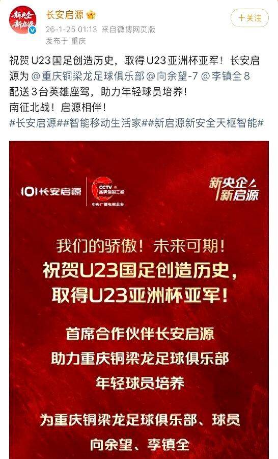 但现实比段子更精彩。当中国队遗憾摘银,长安启源官微突然甩出盖章文件:照常赠送三台车!其中两台给向余望、李镇全个人,另一台归属他们的母队重庆铜梁龙俱乐部。这个神转折让体育博主@足球侦探 连夜发文:见过雪中送炭的,没见过炭火比雪还旺的!