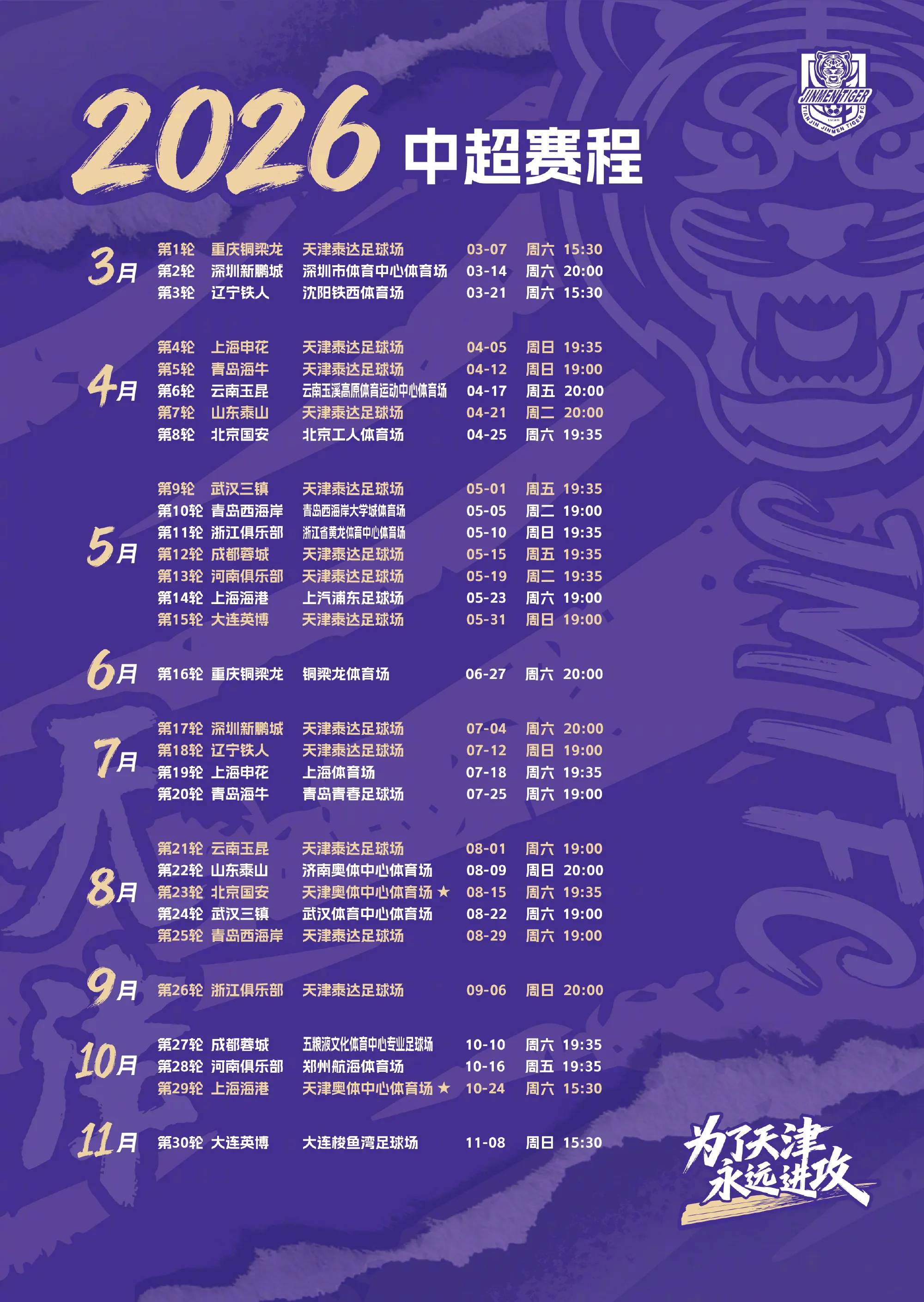 虎扑02月14日讯 中足联官方公布了2026赛季中超联赛赛程。天津津门虎首轮迎战重庆铜梁龙,第八轮迎来京津德比。