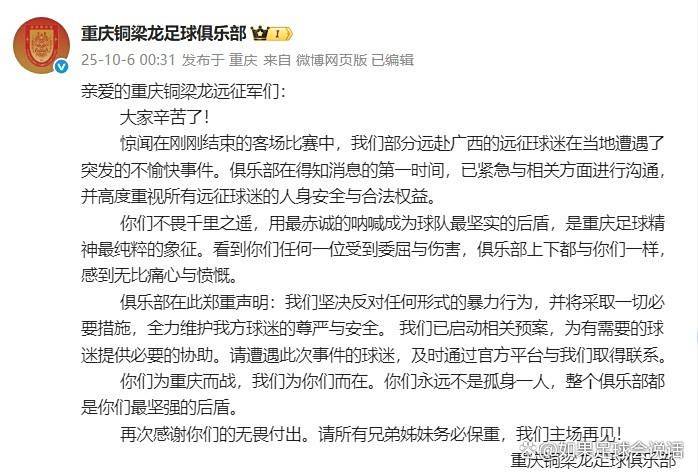 渝超,重庆城市足球联赛,渝超赛程,渝超直播,渝超积分榜,渝超球队/渝超(重庆城市足球联赛)为重庆足球迷带来最新赛程、比分、积分榜、球队信息及直播入口,精彩赛事一网打尽。10月6日的中甲赛场,真是戏比球赛还精彩!重庆铜梁龙客场2-1掀翻广西平果哈嘹,本来是一场关乎冲超和保级的硬仗,结果赛后双方球迷直接上演“全武行”,愣是把体育频道变成了社会新闻现场。这边重庆官方连夜发声明,坚决反对暴力,那边网友已经吵翻了天:这足球的火药味,咋还蔓延到场外了?