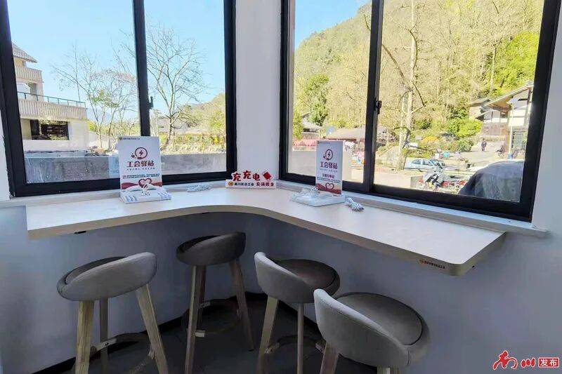 几十公里外的德隆镇银杏村,深秋时节,约3000株野生银杏组成的群落吸引着八方游客,高峰期日接待量超2000人次。而一旁的工会驿站,则成了游客赏景之余的歇脚处。“看完银杏,进来喝口热水、充充电,旅途的疲惫都消了一半。”一名游客说。